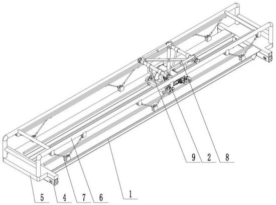 專(zhuān)利摘要顯示,本發(fā)明公開(kāi)一種雙梁橋式起重機(jī)主梁平衡裝置,涉及起重設(shè)備領(lǐng)域,旨在解決現(xiàn)有的雙梁起重機(jī)在移動(dòng)過(guò)程中由于啃軌導(dǎo)致的軌道磨損和車(chē)輪損壞,從而避免起重設(shè)備運(yùn)行不穩(wěn)定及存在安全隱患的問(wèn)題,包括承軌梁,承軌梁中部滑動(dòng)連接有起吊架,起吊架上設(shè)有起吊組件,承軌梁的兩端均固定連接有承重梁,承重梁的外側(cè)固定連接有平衡塊,平衡塊上固定連接有兩個(gè)對(duì)稱(chēng)分布的承重桿,承重桿與承軌梁之間安裝有牽引組件,兩個(gè)承重桿上滑動(dòng)連接有調(diào)節(jié)架,調(diào)節(jié)架與起吊架之間安裝有連接組件,優(yōu)點(diǎn)在于:通過(guò)平衡塊以及承重桿在承軌梁加裝一個(gè)輔助梁,承重桿上的調(diào)節(jié)架用于輔助起吊架,減小起吊架向下的負(fù)載,減小起吊架移動(dòng)過(guò)程中的啃軌問(wèn)題。