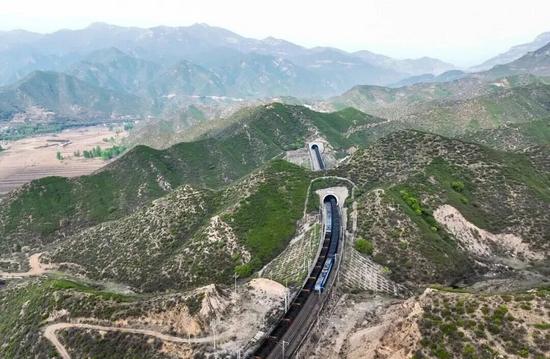 圖為三萬(wàn)噸重載列車(chē)穿行在太行山脈之間