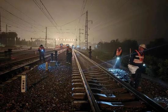 圖為肅寧公司員工進(jìn)行雨中巡視檢查