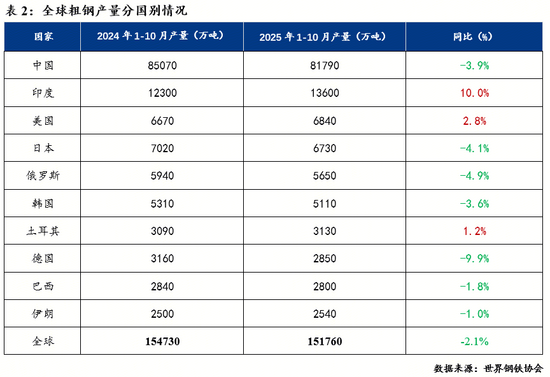 2025年1-10月,全球粗鋼產(chǎn)量下降2970萬(wàn)噸。其中,中國(guó)粗鋼產(chǎn)量下降3280萬(wàn)噸,其他國(guó)家產(chǎn)量同比增加310萬(wàn)噸。中國(guó)粗鋼產(chǎn)量下降是影響全球粗鋼產(chǎn)量下降的核心因素,印度產(chǎn)量增加是支撐海外粗鋼產(chǎn)量小增的核心因素,1-10月同比增加1300萬(wàn)噸。