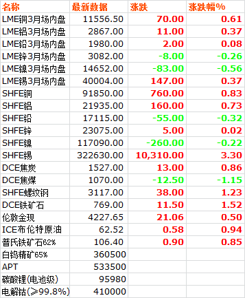 1210日,LME六種基本金屬價(jià)格漲多跌少。三月期銅價(jià)收于11556.5美元噸,上漲0.61%。三月期鋁價(jià)收于2867美元噸,上漲0.37%。三月期鉛價(jià)收于1980美元噸,上漲0.08%。三月期鋅價(jià)收于3082美元噸,下跌0.26%。三月期錫價(jià)收于40004美元噸,上漲0.37%。三月期鎳價(jià)收于14652美元噸,下跌0.56%