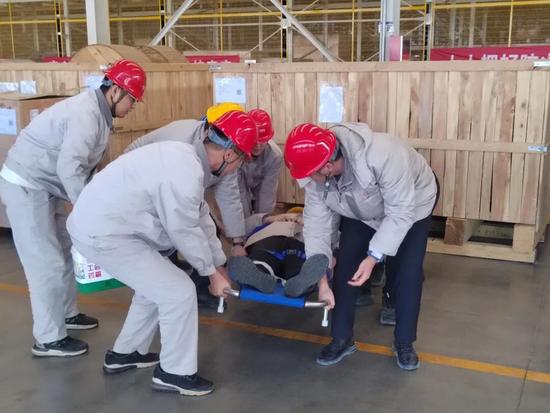 隨著總指揮一聲令下,演練開始。參演人員模擬叉車在轉(zhuǎn)運貨物時,因視線受阻,撞倒庫管員,導(dǎo)致其腿部受傷?!笆鹿省卑l(fā)生后,警戒疏散組第一時間設(shè)立警戒線,疏導(dǎo)人員、維持秩序;醫(yī)療救援組迅速對傷員進(jìn)行救治并送醫(yī);搶險救援組及時將叉車熄火并穩(wěn)固貨物,防止二次傷害;后勤保障組全程提供應(yīng)急物資支持。歷時五分鐘的演練,分工明確、流程清晰、反應(yīng)迅速、銜接流暢,達(dá)到了預(yù)期效果,為現(xiàn)場應(yīng)對突發(fā)安全事故積累了實戰(zhàn)經(jīng)驗。