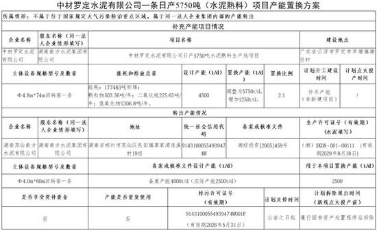 根據(jù)公示,中材羅定水泥有限公司日產(chǎn)5750噸水泥熟料生產(chǎn)線設(shè)計(jì)產(chǎn)能4500t/d,增加1250t/d,置換比例為2:1。湖南蘇仙南方水泥有限公司一條2500t/d水泥熟料線用于本項(xiàng)目置換產(chǎn)能,該生產(chǎn)線計(jì)劃在履行國(guó)有資產(chǎn)處置程序后拆除。