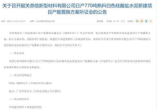 日前,廣東韶關(guān)市工業(yè)和信息化局發(fā)布《關(guān)于召開韶關(guān)鼎信新型材料有限公司日產(chǎn)770噸熟料白色硅酸鹽水泥新建項目產(chǎn)能置換方案聽證會的公告》稱,為貫徹落實《水泥玻璃行業(yè)產(chǎn)能置換實施辦法(2024年本)》等文件精神,依法依規(guī)從嚴審核跨省水泥建設(shè)項目產(chǎn)能置換方案,防止弄虛作假,消除新增產(chǎn)能隱患,現(xiàn)委托中國建筑材料工業(yè)規(guī)劃研究院,擬組織召開鼎信新型材料有限公司日產(chǎn)770噸熟料白色硅酸鹽水泥新建項目產(chǎn)能置換方案聽證會