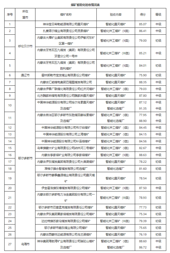 內(nèi)蒙古自治區(qū)能源局關(guān)于神華寶日希勒能源有限公司露天煤礦等27處煤礦及選煤廠智能化驗(yàn)收結(jié)果的公示