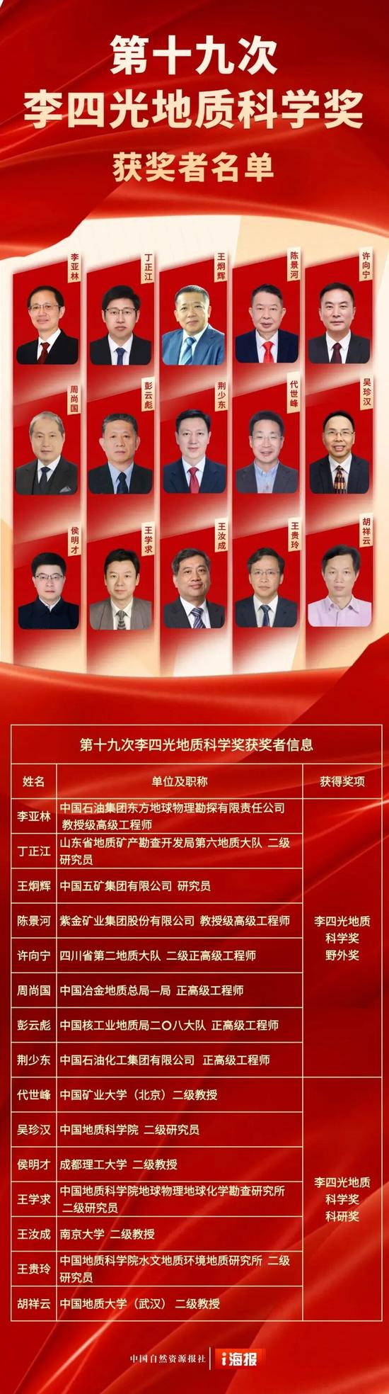 根據(jù)《李四光地質(zhì)科學(xué)獎?wù)鲁獭芬?guī)定,經(jīng)李四光地質(zhì)科學(xué)獎委員會十屆二次會議決定,授予李亞林、丁正江、王炯輝、陳景河、許向?qū)?、周尚國、彭云彪、荊少東8人李四光地質(zhì)科學(xué)獎野外獎,代世峰、吳珍漢、侯明才、王學(xué)求、王汝成、王貴玲、胡祥云7人李四光地質(zhì)科學(xué)獎科研獎。部領(lǐng)導(dǎo)和李四光地質(zhì)科學(xué)獎委員會副主任為獲獎?wù)哳C獎。熊盛青、代世峰、丁正江三位新老獲獎代表發(fā)言。