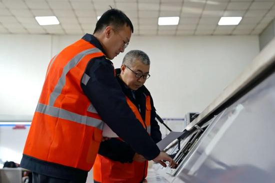 登上司機室后,“大車”迅速進入工作狀態(tài),按流程高效嚴謹?shù)赝瓿山唤影嘧鳂I(yè)。隨后,他們立即對儀表、制動系統(tǒng)、信號指令等進行發(fā)車前全項核驗,筑牢安全防線。