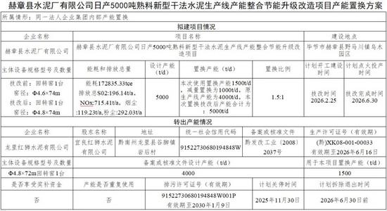 根據(jù)公示,赫章縣水泥廠有限公司日產(chǎn)5000噸熟料新型干法水泥生產(chǎn)線產(chǎn)能整合節(jié)能升級改造項目本次使用置換產(chǎn)能1500t/d,減量置換為1000t/d,原生產(chǎn)線產(chǎn)能為4000t/d,置換比例為1.5:1,計劃技改開工時間為2026年2月25日,點火投產(chǎn)時間為2026年6月30日。龍里紅獅水泥有限公司一條4000t/d水泥熟料線中的1500t/d用于本項目置換產(chǎn)能,計劃2026年6月30日前拆除退出。