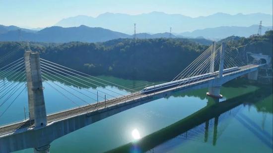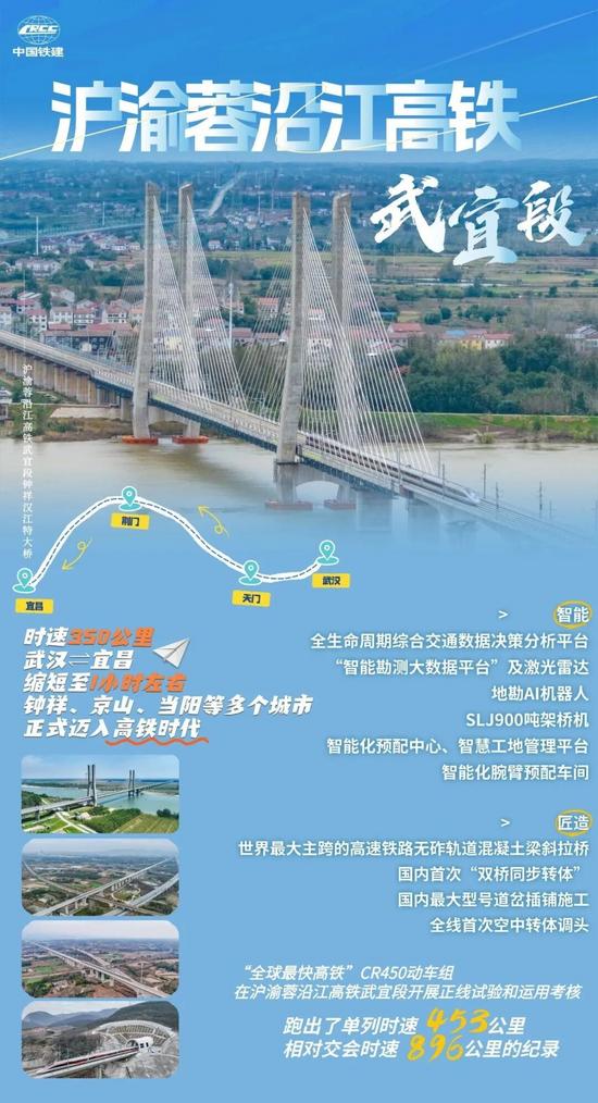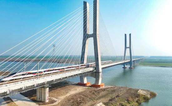 武宜高鐵鐘祥漢江鐵路特大橋主橋是世界最大主跨的高速鐵路無砟軌道混凝土梁斜拉橋,也是全線控制性工程,設(shè)計(jì)主跨270米,以斜拉橋形式跨越漢江航道。CR450動(dòng)車組試驗(yàn)期間,列車過橋時(shí)速達(dá)415公里,將國(guó)內(nèi)大跨度橋梁列車過橋試驗(yàn)速度提升至新高度。