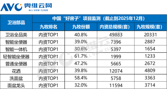 奧維云網(wǎng)最新發(fā)布的監(jiān)測(cè)報(bào)告顯示,在中國(guó)“好房子”項(xiàng)目配套中,九牧以40.8%的份額位居衛(wèi)浴全品類內(nèi)資品牌第一。在7個(gè)細(xì)分品類中——包括智能坐便器、智能一體機(jī)、輕智能坐便器、普通坐便器、花灑洗面盆、面盆龍頭——九牧均位列內(nèi)資品牌榜首。這一數(shù)據(jù)來(lái)自中國(guó)房地產(chǎn)“好房子”項(xiàng)目監(jiān)測(cè)數(shù)據(jù)庫(kù),具有充分的權(quán)威性。