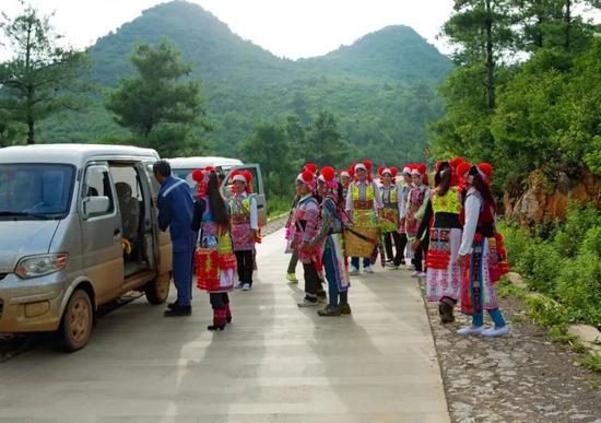 ▲瀘西縣向陽(yáng)鄉(xiāng)阿洞村沙馬公路,群眾在等待出行。(供圖:紅河州交通運(yùn)輸局
