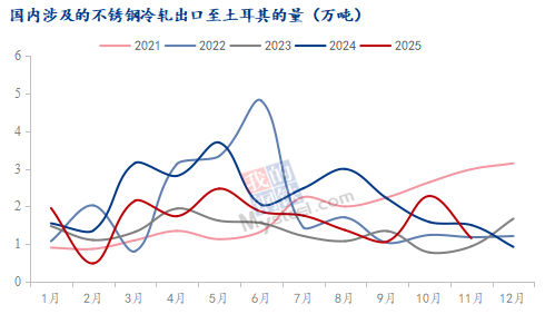 2025年1-11月,國內(nèi)涉及的不銹鋼冷軋出口土耳其的累計量約18.3萬噸,同比減少7.1萬噸,減幅27.9%。