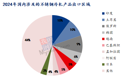 國內(nèi)不銹鋼冷軋出口占比較高,2024年該量約284.4萬噸,約占國內(nèi)出口總量的56.7%。