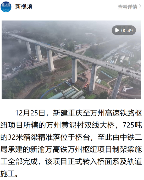 新渝萬高鐵萬州樞紐項目完成制架梁施工