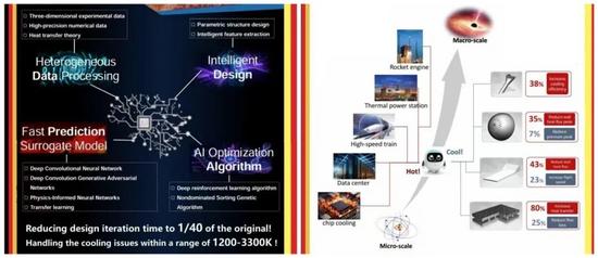 針對(duì)動(dòng)力設(shè)備中極端熱負(fù)荷的挑戰(zhàn),揭示了諸多場(chǎng)景中湍流各向異性對(duì)熱部件中近壁冷氣輸運(yùn)的控制機(jī)制,融合該機(jī)理機(jī)制和多源數(shù)據(jù)采用人工智能方法發(fā)展了物理信息嵌入的智能代理模型,提出了近壁射流冷卻的智能化優(yōu)化方法,將冷卻結(jié)構(gòu)設(shè)計(jì)迭代周期縮短至原來(lái)的幾十分之一,搭建的智能冷卻設(shè)計(jì)優(yōu)化平臺(tái)能應(yīng)對(duì)數(shù)千開(kāi)爾文的高溫冷卻問(wèn)題。該成果獲得了20項(xiàng)專利、5項(xiàng)軟件著作權(quán)和110多篇論文,2025年獲得德國(guó)紐倫堡國(guó)際發(fā)明展銀獎(jiǎng)。