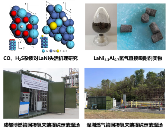 高純/超高純H是我國(guó)芯片半導(dǎo)體行業(yè)(電子特氣)所必需,關(guān)乎中美交鋒核心領(lǐng)域。高效H制取與凈化是工業(yè)氣體中上游核心技術(shù),是實(shí)現(xiàn)H高純安全供應(yīng)的基礎(chǔ)?;诿芏确汉碚?DFT)通過(guò)分子動(dòng)力學(xué)模擬(AIMD)解釋LaNi失活因素,據(jù)此提出增加Al配比、表面氟化、升溫運(yùn)行以增強(qiáng)對(duì)CO、HS雜質(zhì)耐受,據(jù)此合成了LaNi4.3Al0.7合金氫氣直接吸附吸附劑,可以從各類貧氫-富氫場(chǎng)景選擇性吸附氫氣。重構(gòu)了單塔-雙碳-四塔氫氣直接凈化分離新工藝實(shí)現(xiàn)了氫氣純度≥99%、氫氣收率≥93%雙高,進(jìn)一步提出中溫氫氣吸附耦合鈀膜分離溫場(chǎng)協(xié)同制取超純氫,設(shè)計(jì)建設(shè)了氫氣直接吸附-膜分離高效聯(lián)合提純?cè)O(shè)備,于深圳燃?xì)?、成都博能氫能科技公司開(kāi)展了管網(wǎng)摻氫(摻氫10~15%)末端氫氣提純示范,實(shí)現(xiàn)了氫氣純度99.99999%(7N),達(dá)到電子特氣品質(zhì);實(shí)驗(yàn)驗(yàn)證了設(shè)備壽命大于8000小時(shí)。該成果被評(píng)價(jià)為“突破了鑭鎳鋁氫氣直接吸附劑中溫耐毒機(jī)理、成型、工藝與裝備一體化技術(shù),與鈀膜分離溫場(chǎng)協(xié)同實(shí)現(xiàn)了超純氫純化”,為從低濃度混合氣中高效提取超高純電子級(jí)氫氣提供了新實(shí)踐路徑。
