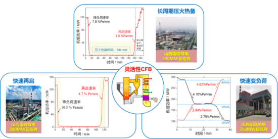 技術(shù)創(chuàng)新:研發(fā)了鍋爐蓄能技術(shù)和基于燃燒-循環(huán)干預(yù)的負(fù)荷調(diào)節(jié)技術(shù),發(fā)明了CFB鍋爐長(zhǎng)周期壓火熱備和快速變負(fù)荷相關(guān)裝置,攻克了煤電機(jī)組超低蒸汽流量連續(xù)穩(wěn)定運(yùn)行、無(wú)輔助能源快速變負(fù)荷、全負(fù)荷污染物排放控制等系列難題。