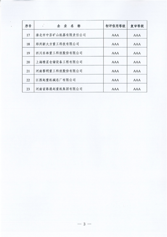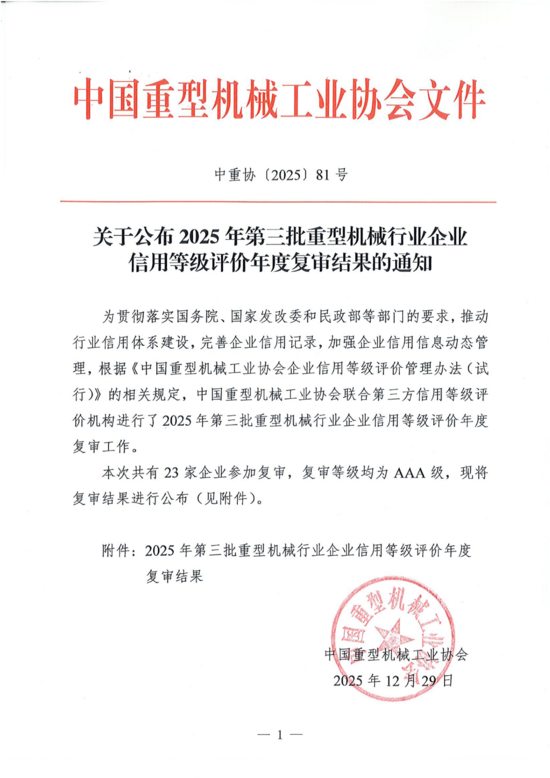 關(guān)于公布2025年第三批重型機(jī)械行業(yè)企業(yè)信用等級(jí)評(píng)價(jià)年度復(fù)審結(jié)果的通知