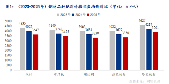 2025年12月26日,五大鋼材品種絕對(duì)價(jià)格指數(shù)全年同比均呈下跌態(tài)勢,整體跌幅集中在 7%-10% 區(qū)間,分化相對(duì)溫和。其中,螺紋鋼跌幅居首,同比下跌 9.61%,主要受房地產(chǎn)用鋼需求持續(xù)疲軟拖累,建筑用鋼消費(fèi)端支撐不足,線材跌幅相近,為9.32%。熱軋板卷面臨國內(nèi)供給高位與出口壓力疊加的雙重挑戰(zhàn),跌幅為8.94%。而冷軋板卷與中厚板跌幅相對(duì)較小,降幅分別為7.49%及7.16%,主要還是由于這兩大品種下游需求韌性更強(qiáng)以及供應(yīng)端結(jié)構(gòu)性優(yōu)化。