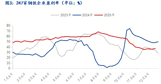 據(jù)Mysteel統(tǒng)計(jì),截至2025年12月26日,247家鋼鐵企業(yè)平均盈利率為53.9%,同比增長18.1%。從圖3可以看出,1-3月,247家鋼鐵企業(yè)平均盈利率為51.45%;4-6月,企業(yè)平均盈利率為58.04%;7-9月企業(yè)平均盈利率為62.04%;10-12月,企業(yè)平均盈利率為41.77%。