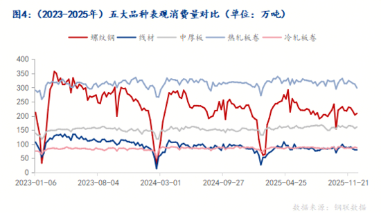 據(jù) Mysteel 統(tǒng)計(jì),截止 2025 年 12 月 26 日,2025 年 1-12 月五大鋼材品種累計(jì)表觀消費(fèi)量預(yù)計(jì)達(dá) 4.43億噸,同比增長 6.06%。截止2025年12月19日,1-12月建材消費(fèi)總消費(fèi)量在1.07億噸,年同比降5.4%;線材總消費(fèi)量在4135.51萬噸,同比降幅7.42%;中厚板總消費(fèi)量在8196.34萬噸,同比增幅4.92%;熱軋板卷總消費(fèi)量在1.65億噸,同比增幅1.16%;冷軋板卷總消費(fèi)量在4461.7萬噸,同比增幅1.51%。