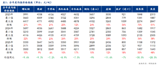 隨著市場供需關(guān)系、政策預(yù)期的不斷變化調(diào)整,2025年鋼價(jià)全年呈現(xiàn)“回落 - 反彈 - 震蕩”的三段走勢。從全年振幅來看,2025 年是近3年成材價(jià)格波動(dòng)幅度最小的一年,而原料端中,鋼坯、廢鋼、鐵礦石同比振幅均有收窄,而雙焦全年價(jià)格同比波動(dòng)幅度更為顯著,這既與行業(yè)供需結(jié)構(gòu)變化有關(guān),也體現(xiàn)出成本端對(duì)下游品類的傳導(dǎo)壓力有所減弱。結(jié)合 2023-2025 年的價(jià)格走勢與行業(yè)供需邏輯,預(yù)計(jì)2026 年成材、原料價(jià)格或結(jié)束 “持續(xù)下行”,進(jìn)入 “底部溫和修復(fù)、波動(dòng)區(qū)間收窄” 的階段。