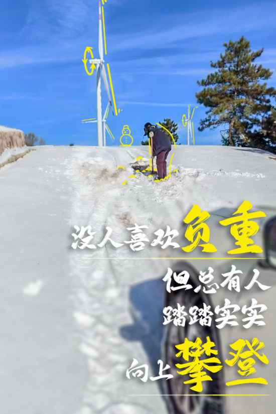雪坡陡峭,積雪沒途。在用戶風電項目現(xiàn)場,維護人員揮鏟破雪開道,與嚴寒搶時間、為風機保運行。風雪中,總有人為保障萬家燈火,選擇迎風而上、向山而行。
