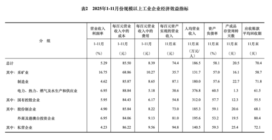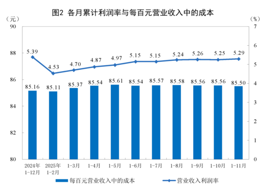 11月份,規(guī)模以上工業(yè)企業(yè)實現營業(yè)收入125.34萬億元,同比增長1.6%;發(fā)生營業(yè)成本107.17萬億元,增長1.8%;營業(yè)收入利潤率為5.29%,同比下降0.08個百分點。