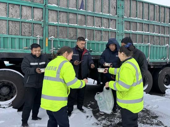 12月25日,公路運(yùn)營(yíng)公司京新項(xiàng)目經(jīng)理部在因天氣原因道路封閉、車輛滯留期間,迅速組織工作人員為現(xiàn)場(chǎng)司乘提供熱餐服務(wù)。