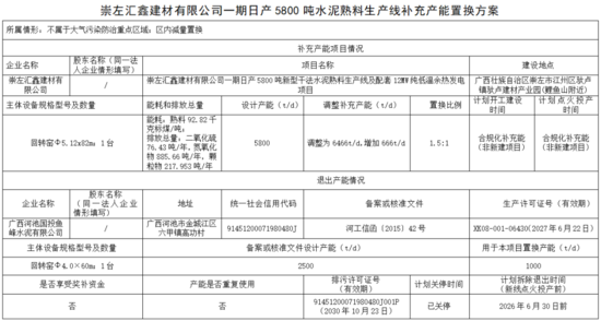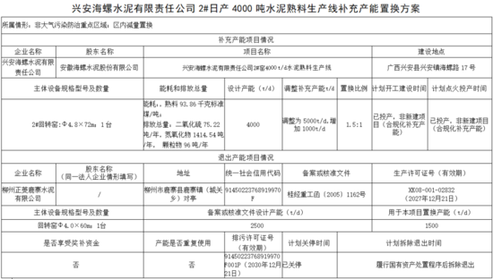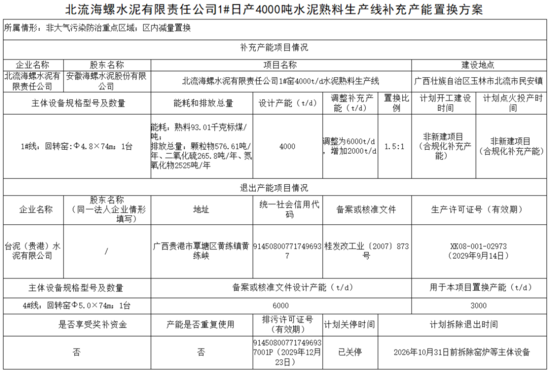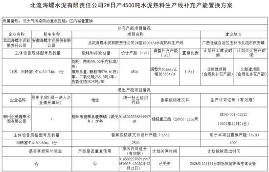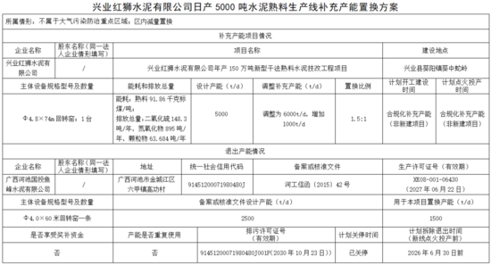 廣西河池國投魚峰水泥有限公司一條2500t/d水泥熟料線產(chǎn)能中的1000t/d和1500t/d按照1.5:1的比例,分別用于崇左匯鑫建材有限公司一期日產(chǎn)5800噸新型干法水泥熟料生產(chǎn)線及配套12MW純低溫余熱發(fā)電項目興業(yè)紅獅水泥有限公司年產(chǎn)150萬噸新型干法熟料水泥技改工程項目產(chǎn)能置換。該生產(chǎn)線目前已關(guān)停,計劃2026年6月30日前拆除退出。