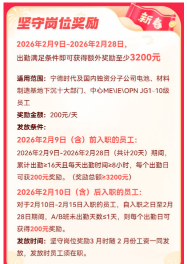 針對2026年2月9日至2月28日(春節(jié)期間)出勤滿足條件的員工(主要覆蓋電池、材料制造基地下沉部門及JG1-10級員工),可獲得至少3200元額外獎勵。以JG2直接生產(chǎn)崗位員工為例,若獎勵期出勤超過16天且2月總出勤達(dá)25天,當(dāng)月綜合收入可達(dá)11500元(含綜合工資8300元+堅守獎勵3200元)。