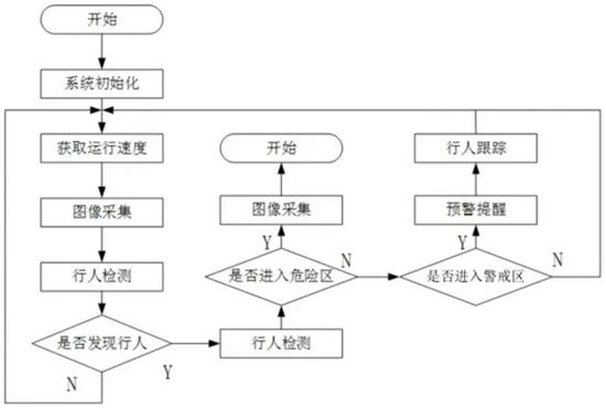 專利摘要顯示,發(fā)明涉及起重機安全運行技術(shù)領(lǐng)域的一種基于YOLOv5s網(wǎng)絡(luò)的橋式起重機實時識別預(yù)警方法,包含以下步驟:S1、建立起重機安全距離模型,劃分警戒區(qū)域和危險區(qū)域;S2、初始化系統(tǒng);S3、獲取起重機運行速度;S4、采集并利用YOLOv5s檢測算法處理圖像信息,獲得目標(biāo)位姿;S5、若通過圖像行人檢測沒有發(fā)現(xiàn)行人,返回S3;否則,檢測是否進入危險區(qū)域;S6、若行人進入危險區(qū)域,控制起重機制動,結(jié)束預(yù)警;否側(cè),判斷是否進入警戒區(qū)域;S7、若行人進入警戒區(qū)域,發(fā)出警報;若行人沒有進入或者遠離警戒區(qū)域,返回S3;該方法通過精準(zhǔn)的行人檢測與跟蹤,以及實時預(yù)警和智能決策,提高了橋式起重機的安全管理水平,保障作業(yè)人員的生命安全。