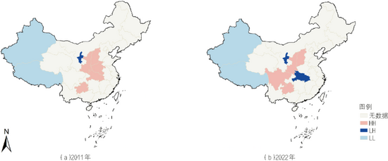 2011年及2022年農(nóng)業(yè)經(jīng)濟灌溉水分生產(chǎn)率LISA聚集圖〔注:該圖基于國家測繪地理信息局標準地圖服務(wù)網(wǎng)站下載的審圖號為GS(2024)0650號的標準地圖制作,底圖無修改。〕