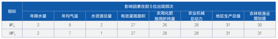 各省份影響農(nóng)業(yè)經(jīng)濟水分生產(chǎn)率(WP)和農(nóng)業(yè)經(jīng)濟灌溉水分生產(chǎn)率(WP)重要性排名前五的因素頻次統(tǒng)計