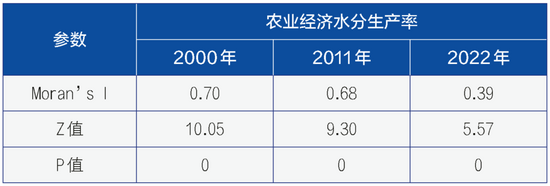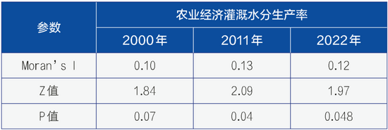 代表年份農(nóng)業(yè)經(jīng)濟水分生產(chǎn)率Moran’s I指數(shù)與顯著性檢驗
