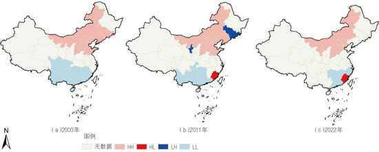 ▲2000年、2011年及2022年農(nóng)業(yè)經(jīng)濟水分生產(chǎn)率LISA聚集圖〔注:該圖基于國家測繪地理信息局標準地圖服務(wù)網(wǎng)站下載的審圖號為GS(2024)0650號的標準地圖制作,底圖無修改?!?/span>