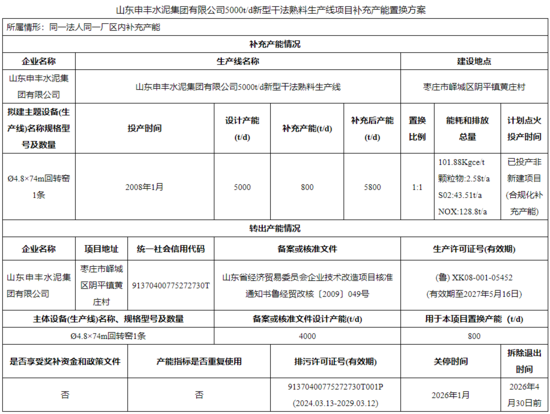 山東申豐水泥集團(tuán)有限公司5000t/d新型干法熟料生產(chǎn)線補(bǔ)充產(chǎn)能800t/d,補(bǔ)充后產(chǎn)能5800t/d,置換比例為1:1;