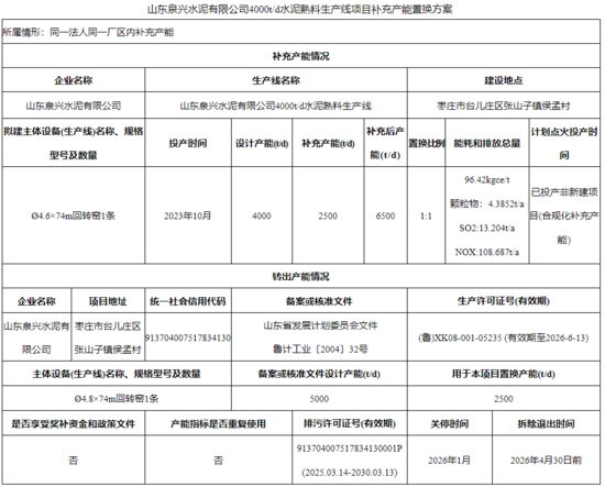 山東泉興水泥有限公司4000t/d水泥熟料生產(chǎn)線補(bǔ)充產(chǎn)能2500t/d,補(bǔ)充后產(chǎn)能6500t/d,置換比例為1:1;