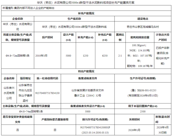 根據(jù)公示,山東泉興水泥有限公司一條5000t/d水泥熟料線產(chǎn)能分別用于該公司4000t/d水泥熟料生產(chǎn)線和華沃(棗莊)水泥有限公司5000t/d新型干法水泥熟料線補(bǔ)充產(chǎn)能,該生產(chǎn)線計(jì)劃2026年4月30日前拆除退出。
