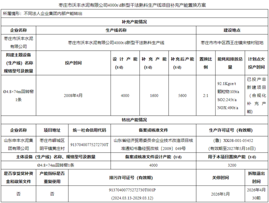 山東申豐水泥集團(tuán)有限公司4000t/d水泥熟料線產(chǎn)能分別用于該公司5000t/d新型干法熟料生產(chǎn)線和棗莊市沃豐水泥有限公司4000t/d新型干法熟料生產(chǎn)線補(bǔ)充產(chǎn)能,該生產(chǎn)線計(jì)劃2026年4月30前拆除退出。