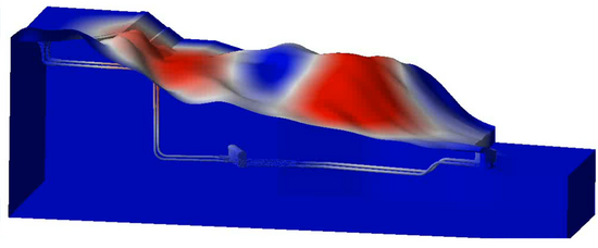 項(xiàng)目建立了電站機(jī)組與輸水系統(tǒng)全三維瞬態(tài)空化多相流模型,攻克了千米級輸水系統(tǒng)與毫米級間隙流動的跨尺度耦合計(jì)算難題,揭示了甩負(fù)荷過程極低壓力區(qū)域的空化多相瞬態(tài)流動特性,實(shí)現(xiàn)了壓力脈動值的計(jì)算精度提升;構(gòu)建了水電站山體-輸水系統(tǒng)-廠房-機(jī)組全域流固耦合模型,揭示了附加質(zhì)量、附加阻尼、附加剛度及旋轉(zhuǎn)效應(yīng)對濕模態(tài)和流激響應(yīng)的作用機(jī)制,提升濕模態(tài)與動力響應(yīng)預(yù)測精度,實(shí)現(xiàn)了穩(wěn)態(tài)共振與暫態(tài)瞬時共振頻率和幅值的精準(zhǔn)預(yù)測。