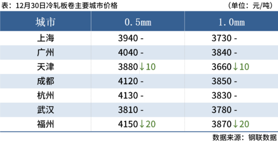 冷軋板卷1230日,全國24個(gè)主要城市1.0mm冷卷均價(jià)3853元/噸,較上一交易日下跌8元/噸。熱卷期貨盤面波動(dòng)下,冷軋板卷市場價(jià)格呈現(xiàn)易跌難漲態(tài)勢,主流市場冷熱價(jià)差有所收縮,市場心態(tài)謹(jǐn)慎度增加,商家多以出貨變現(xiàn)為主。供應(yīng)端持續(xù)維持相對高位,下游訂單一般,需求彈性不足,同時(shí)貿(mào)易環(huán)節(jié)活躍度隨之下降。據(jù)了解,1月份鋼廠接單缺口,部分鋼廠給以額外優(yōu)惠政策接單。綜合來看,預(yù)計(jì)31日全國冷軋板卷價(jià)格延續(xù)震蕩偏弱運(yùn)行。