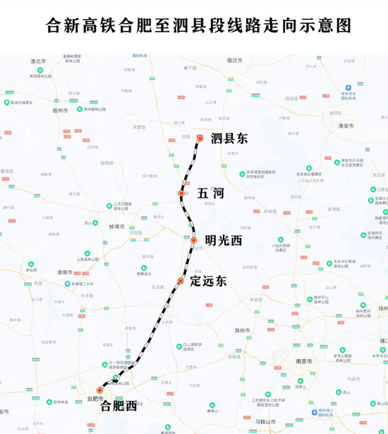 合新高鐵起自安徽省合肥市蜀山區(qū)的合肥西站,經(jīng)安徽省滁州市、蚌埠市、宿州市,江蘇省宿遷市、徐州市,接入位于江蘇省徐州市新沂市的新沂東站,線路全長(zhǎng)約335公里,設(shè)計(jì)時(shí)速350公里,實(shí)行分段建設(shè),此次開(kāi)通的為合肥至泗縣段,其余區(qū)段正在有序推進(jìn)中。