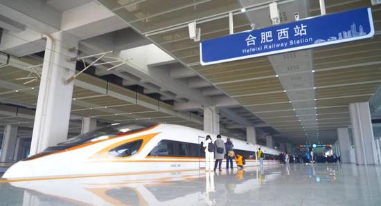 G9500次復(fù)興號(hào)列車靜靜??吭?4號(hào)站臺(tái),顯得尤為耀眼。登上首發(fā)列車前,眾多旅客在“合肥西站”的站牌下拍照留念,見(jiàn)證安徽又一座大型高鐵站——合肥西站同步投入使用。