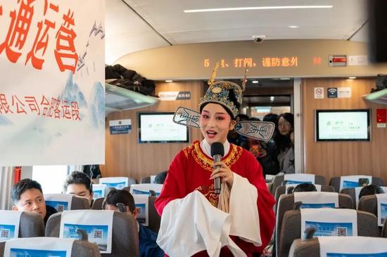 “為救李郎離家園,誰(shuí)料皇榜中狀元……”旅途中,安徽傳統(tǒng)戲曲黃梅戲《女駙馬》、舞蹈劇《歡樂(lè)中國(guó)年》輪番上陣,高亢的唱腔、獨(dú)特的旋律,向旅客充分展現(xiàn)了“徽風(fēng)皖韻”的文化魅力。