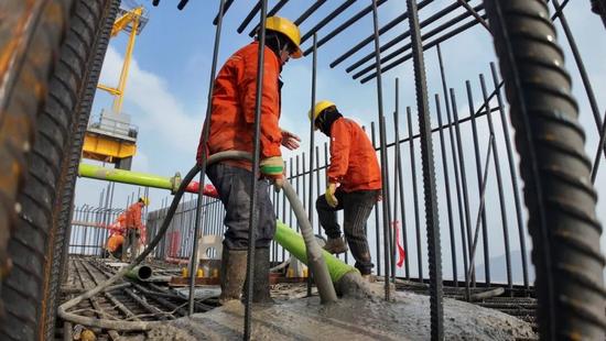 5號(hào)主塔下橫梁為預(yù)應(yīng)力混凝土結(jié)構(gòu),長(zhǎng)44米、寬10米、高8米,鋼筋總使用量約480噸,總澆筑量約3700方,使用3臺(tái)天泵一次澆筑成形,創(chuàng)下了跨海大橋墩身施工一次性澆筑方量的紀(jì)錄。