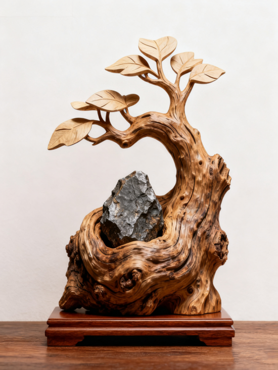 自此,工余時間他便與刻刀、砂紙作伴,礦山周邊山野成了“藏寶圖”:崖壁野棗根虬勁盤曲,溪谷黃荊的根光滑圓潤,深谷老樹根沉厚生香。特別是在尾礦庫壩體撿到的一段桑樹根,腐壞處裹著一塊鐵礦石,礦粒嵌在木紋中,儼然一幅濃縮礦脈圖。