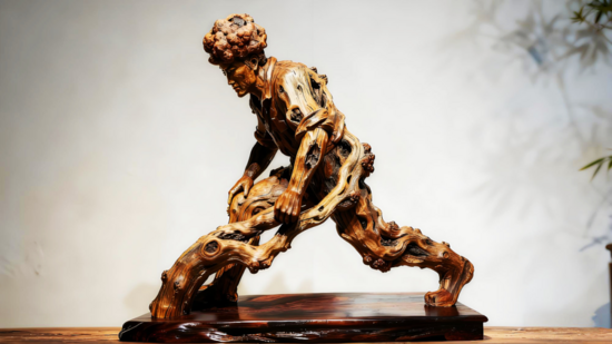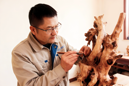 根雕之道,貴在“順勢”。正如操作臺車須順礦體走向,雕琢樹根亦須循其天生骨相。老木匠岳父教他“三分人工,七分天成”:直枝可成風(fēng)骨,盤根能化游龍,即使朽木空洞也可插枝干花自成野趣。他將臺車“順礦脈走,隨巖層動”的竅門融入創(chuàng)作——多余的枝杈留著平衡重心,深裂根痕填環(huán)氧樹脂嵌礦砂,反倒成就獨(dú)有的滄桑。