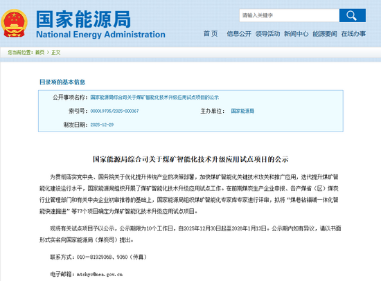 現(xiàn)將有關(guān)試點(diǎn)項(xiàng)目予以公示,公示期限為10個(gè)工作日,自2025年12月30日起至2026年1月13日。公示期內(nèi)如有異議,請(qǐng)以書(shū)面形式實(shí)名向國(guó)家能源局(煤炭司)提出。