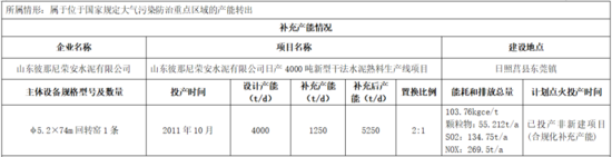 根據(jù)公示,山東彼那尼榮安水泥有限公司日產(chǎn)4000噸新型干法水泥熟料生產(chǎn)線項(xiàng)目補(bǔ)充產(chǎn)能1250t/d,補(bǔ)充后產(chǎn)能5250t/d,置換比例為2:1。山東山鋁環(huán)境新材料有限公司一條2500t/d水泥熟料線用于本項(xiàng)目置換產(chǎn)能。